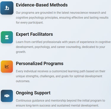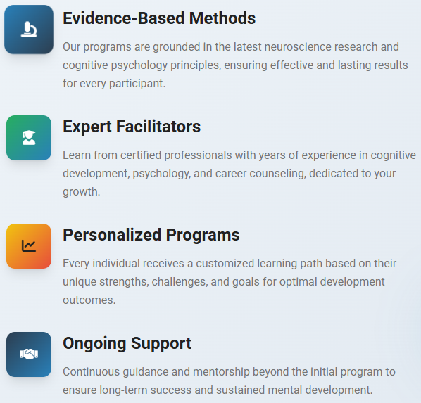 Our unique methodology combines cutting-edge neuroscience with practical training techniques to deliver measurable results in cognitive development and career success.